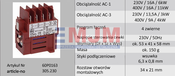 napięcie sterowania cewki Uc= 230V / 50Hz